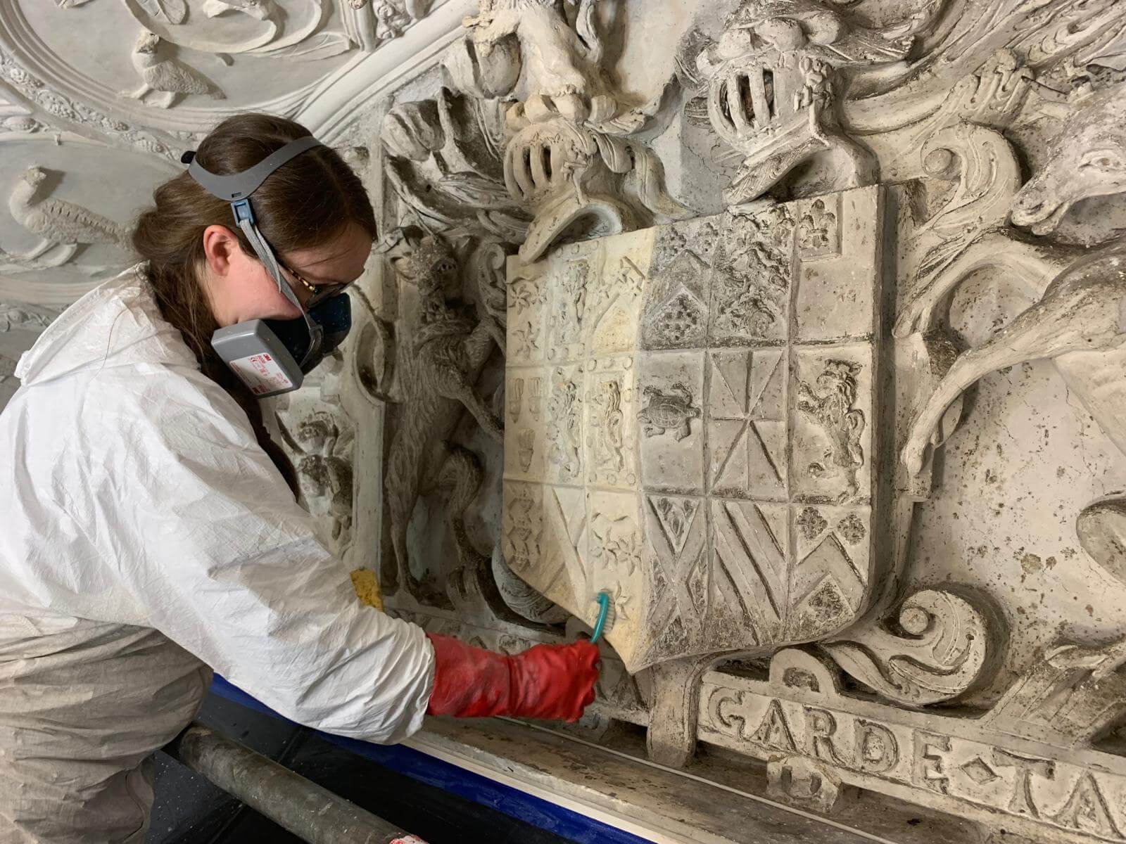 Laura Karoniemi cleaning the lunette at the east end of the Long Gallery, the last area of paint removal.