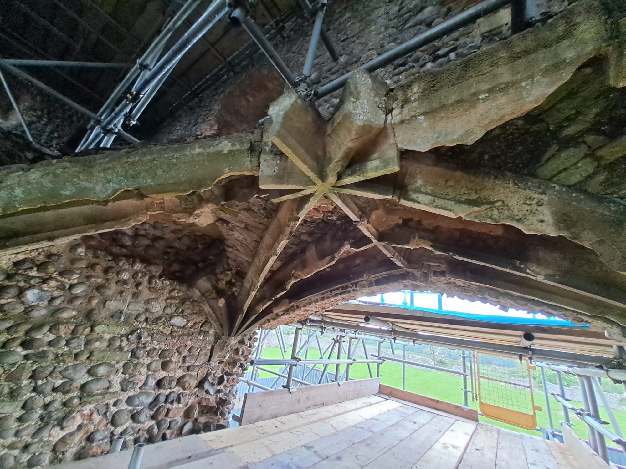 A scheme of works to consolidate and conserve the outer curtain walls, towers, gatehouses and as much of the exterior elevations as possible was required. A new bridge and steel frame for the Inner Gatehouse was specified, as well as masonry repairs to some windows, a section of vaulted ceiling and a fragile brick and stone arch. Rotting timber lintels to several windows were to be replaced with cast concrete lintels – chosen for longevity in such an exposed area.