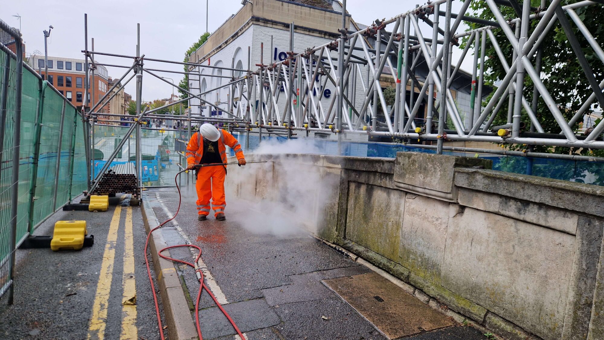 Stonemason cleaning the stonework of the bridge