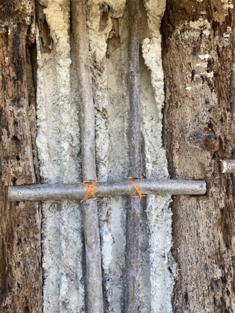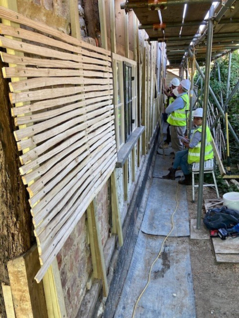 Many of the coppiced hazel poles comprising the wattle had crumbled to dust, leaving corrugated grooves in the daub. New, locally sourced hazel ledgers and wattles were fixed to the oak frame to stabilise the daub panels, and new clay daub was used to consolidate the wattles to the existing panels. Brick infills were consolidated using air lime mortars.