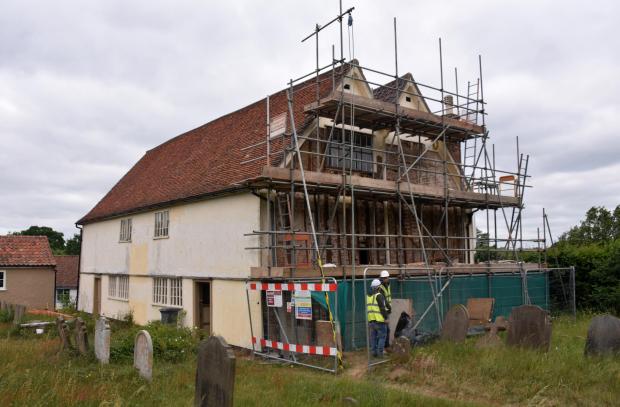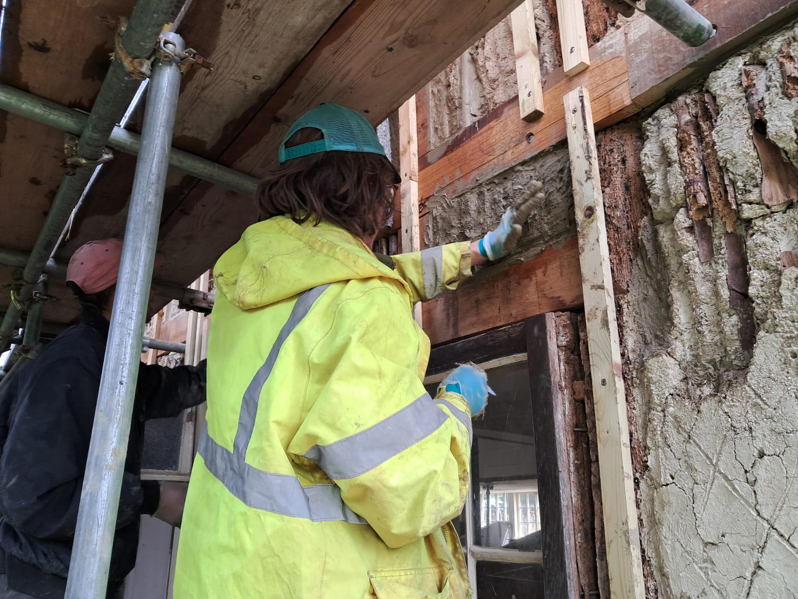 The main scope of works included removal of the failed render and substantial structural repairs to the timber-frame building, retaining as much original material as possible. Hand tools were used throughout to limit vibration to the 17th-century timber frame. Trials for the render removal were conducted in consultation with the conservation architect and engineer, and a timber frame survey was also undertaken.
