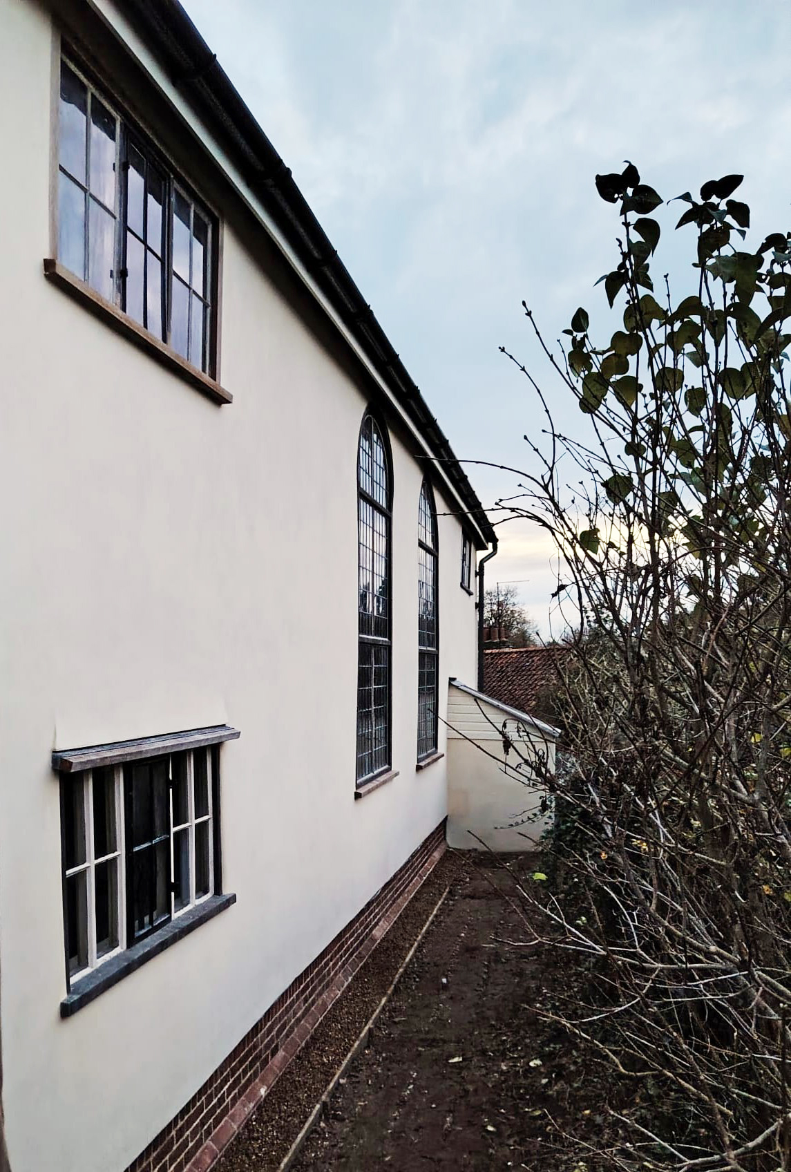 The historic chapel had been previously rendered with inappropriate, very hard, hydraulic and cementitious renders preventing the egress of moisture and without the flexural strength required for a timber-framed building.