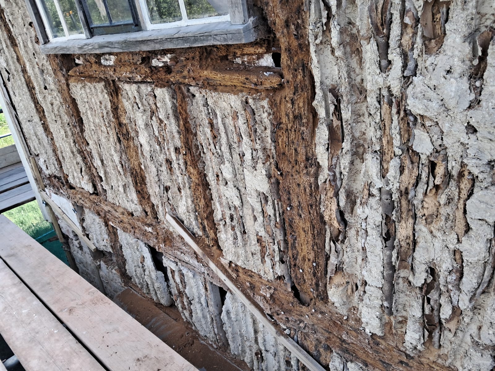 The exposed oak frame showing the extent of insect damage and decay to the oak frame and wattle and daub panels caused by being encased in cement based render.